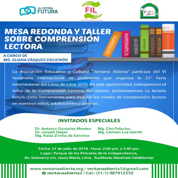 La Asociación Educativa y Cultural Ventana Abierta participa del VI SEMINARIO INTERNACIONAL DE PROFESORES, que organiza la 21 Feria Internacional del Libro 2016, con esta Mesa redonda y Taller. trabajaremos el tema de la Comprensión Lectora.