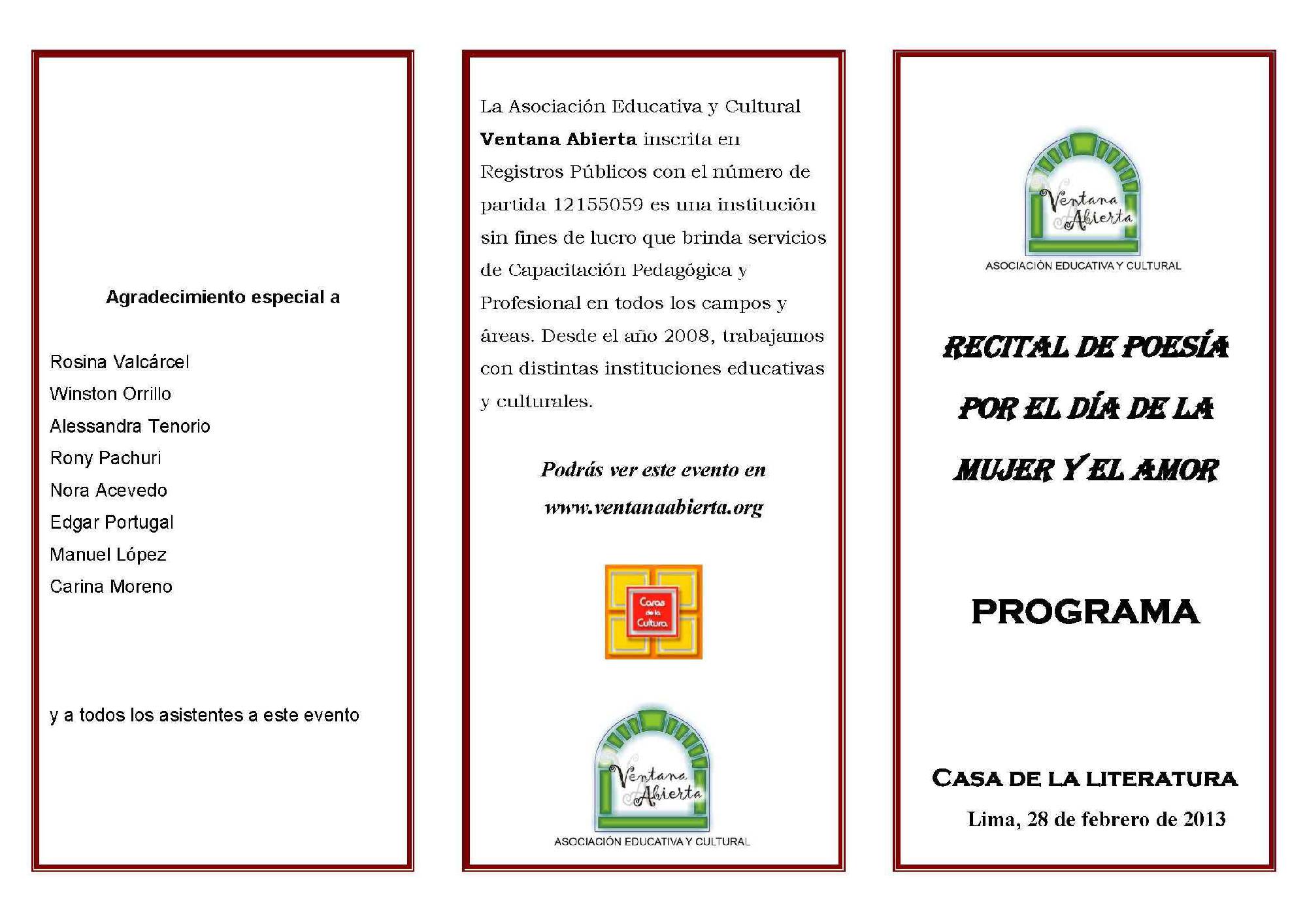 La asociación educativa y cultural “Ventana Abierta” celebró el "Día del amor y la mujer" el pasado 28 de febrero de 2013 de 4:30 p.m. a 8:00 p.m. con una maratón poética en la Casa de la literatura peruana.