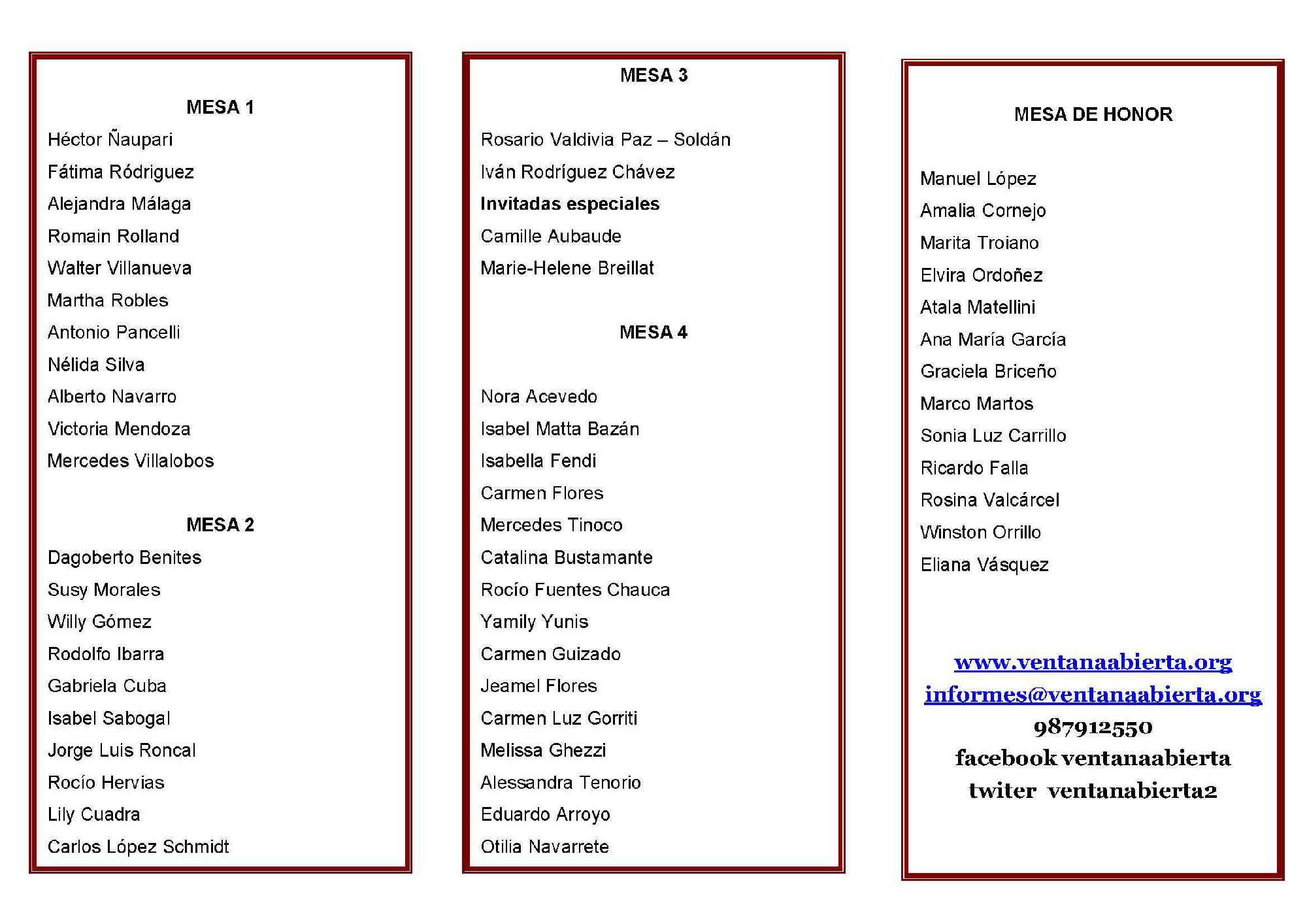 Héctor Ñaupari, Fátima Ródriguez, Alejandra Málaga, Romain Rolland, Walter Villanueva, Martha Robles, Antonio Pancelli, Nélida Silva, Alberto Navarro, Victoria Mendoza, Mercedes Villalobos, Dagoberto Benitez, Susy Morales, Willy Gómez, Rodolfo Ibarra, Gabriela Cuba, Isabel Sabogal, Jorge Luis Roncal, Rocío Hervias, Lily Cuadra, Carlos López Schmidt, Rosario Valdivia Paz – Soldán, Iván Rodríguez Chávez,Nora Acevedo, Isabel Matta Bazán, Isabella Fendi, Carmen Flores, Mercedes Tinoco, Catalina Bustamante, Rocío Fuentes Chauca, Yamily Yunis, Carmen Guizado, Jeamel Flores, Carmen Luz Gorriti, Melissa Ghezzi, Alessandra Tenorio, Eduardo Arroyo, Otilia Navarrete, Manuel López, Amalia Cornejo, Marita Troiano, Elvira Ordoñez, Atala Matellin , Ana María García, Graciela Briceño, Marco Martos, Sonia Luz Carrillo, Ricardo Falla, Rosina Valcárcel, Winston Orrillo, Eliana Vásquez.